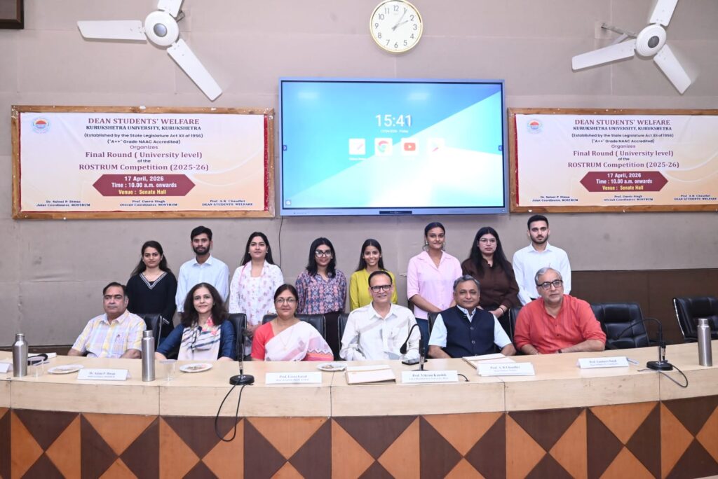 कुरुक्षेत्र, 17 अप्रैल। कुरुक्षेत्र विश्वविद्यालय (Kurukshetra University)के कुलगुरु प्रो. सोमनाथ सचदेवा के मार्गदर्शन में डीन स्टूडेंट वेलफेयर कार्यालय द्वारा आयोजित वार्षिक सार्वजनिक भाषण प्रतियोगिता रोस्ट्रम-2026 के अंतिम चरण का सफल आयोजन शुक्रवार को सीनेट हॉल में किया गया। कार्यक्रम के उद्घाटन सत्र में मुख्य अतिथि के रूप में डीन एकेडमिक अफेयर्स प्रो. राकेश कुमार तथा डीन स्टूडेंट वेलफेयर प्रो. ए.आर चौधरी उपस्थित रहे।